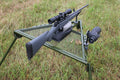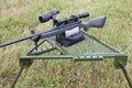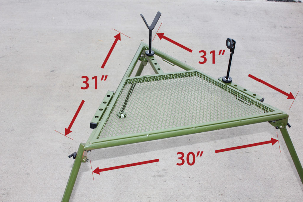 The HYSKORE® Portable Shooting Bench was designed to work well in both field and range shooting environments. The key features of the bench are light weight, easy deployment, and advanced user friendly features. At less than 20 lbs. the bench is easily portable and can be hand carried. The padded V-notch gun support has adjustable elevation and has 4 hard point mounts to accommodate any length of gun and shooter preference. The rest also includes an integral spotting scope mount that can attach to either left or right side and is adjustable for both height and eye relief. The legs are attached with heavy duty MG-42 Machine Gun Rest style connection points that allow 2 different elevations and a storage / transport position all securely anchored by M12 T-bolts. The bench is constructed from heavy duty steel and tubular sections with a light weight, but strong mesh deck. As with the leg mounts, the feet reflect the aggressive design of the MG-42 Machine Gun Rest, and provide stable traction on turf, soil, and most other surfaces.