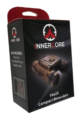 Innercore 10x25 Binoculars are folding roof prism binoculars with 10x magnification and a 25mm objective lens. It also comes with a nylon carry pouch with belt loop and a lens cloth.
